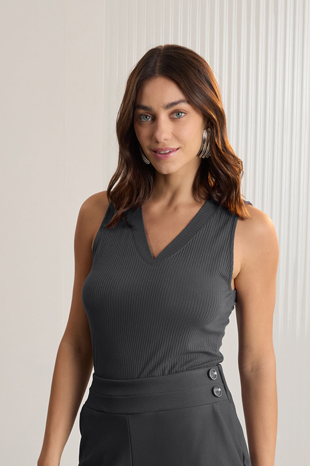 Feita com viscose responsável, Produção com menor impacto ambiental, Malha canelada com elastano, Decote em V, Comprimento regular.