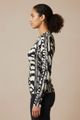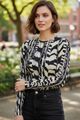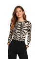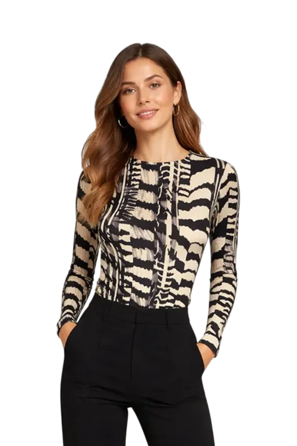 Blusa Estampada Sommer Canelada Bege e Preto vem com decote redondo, malha canelada, manga longa e modelagem ajustada.