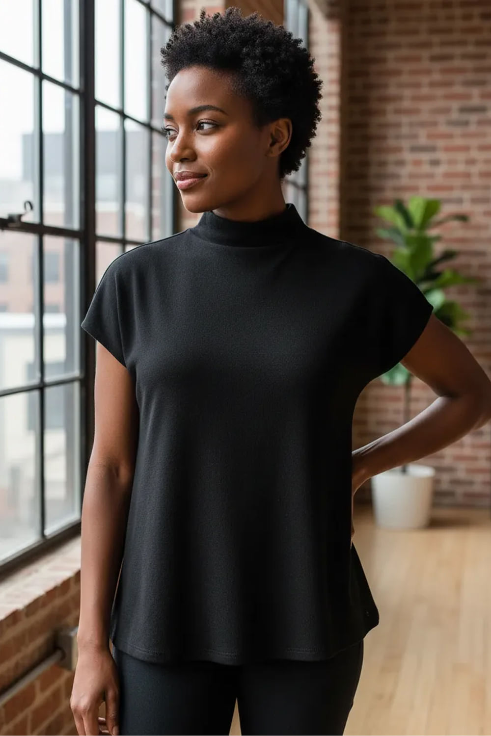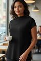 Feita com viscose responsável, Produção com menor impacto ambiental, Malha canelada com elastano, Modelagem alongada, Mangas curtas, Gola alta, Aberturas laterais.