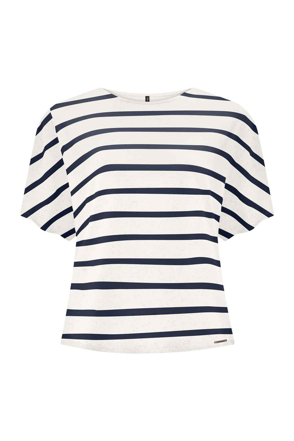 Blusa Lunender De Mangas Curtas Listrada Em Malha Com Linho. A blusa listrada de mangas curtas combina o toque sofisticado do linho com a elasticidade da malha, garantindo um visual atual e descomplicado. Ótima pedida para quem busca estilo e conforto nas produções casuais.