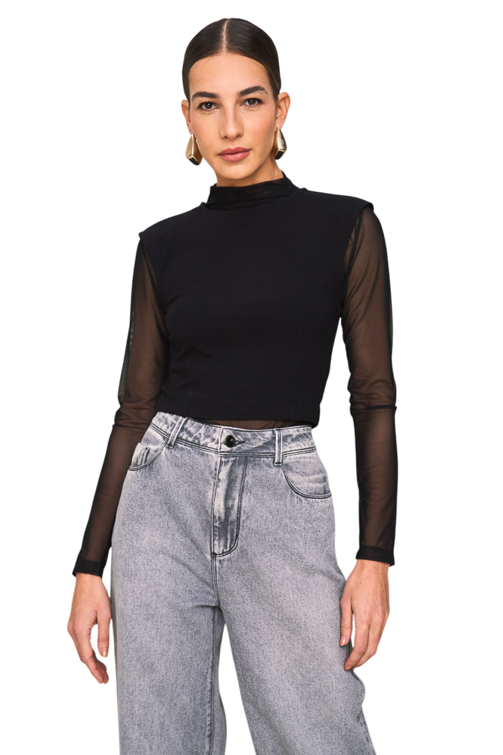 Blusa Manga Longa Lado Avesso em tule é Confeccionada em malha tule com transparência sofisticada, a blusa apresenta shape ajustado ao corpo, mangas longas e gola redonda. A construção valoriza a silhueta e traduz modernidade em uma peça elegante e ideal para a estação.
