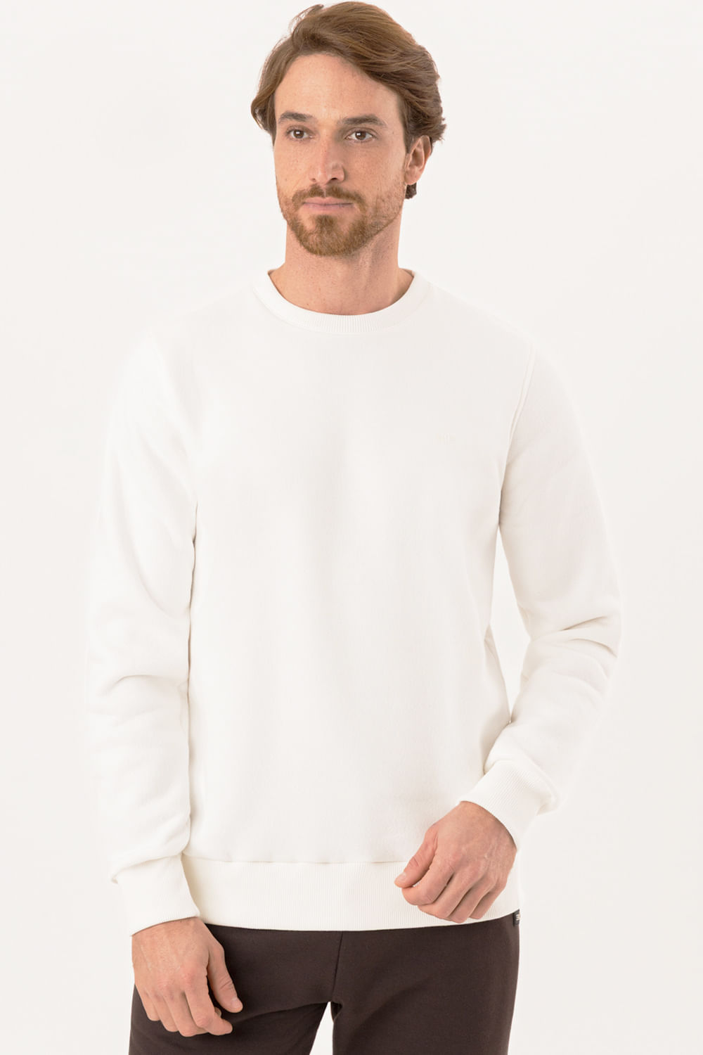 Feito em moletom mais encorpado, Toque macio, Mangas longas, Gola redonda, Caimento confortável.