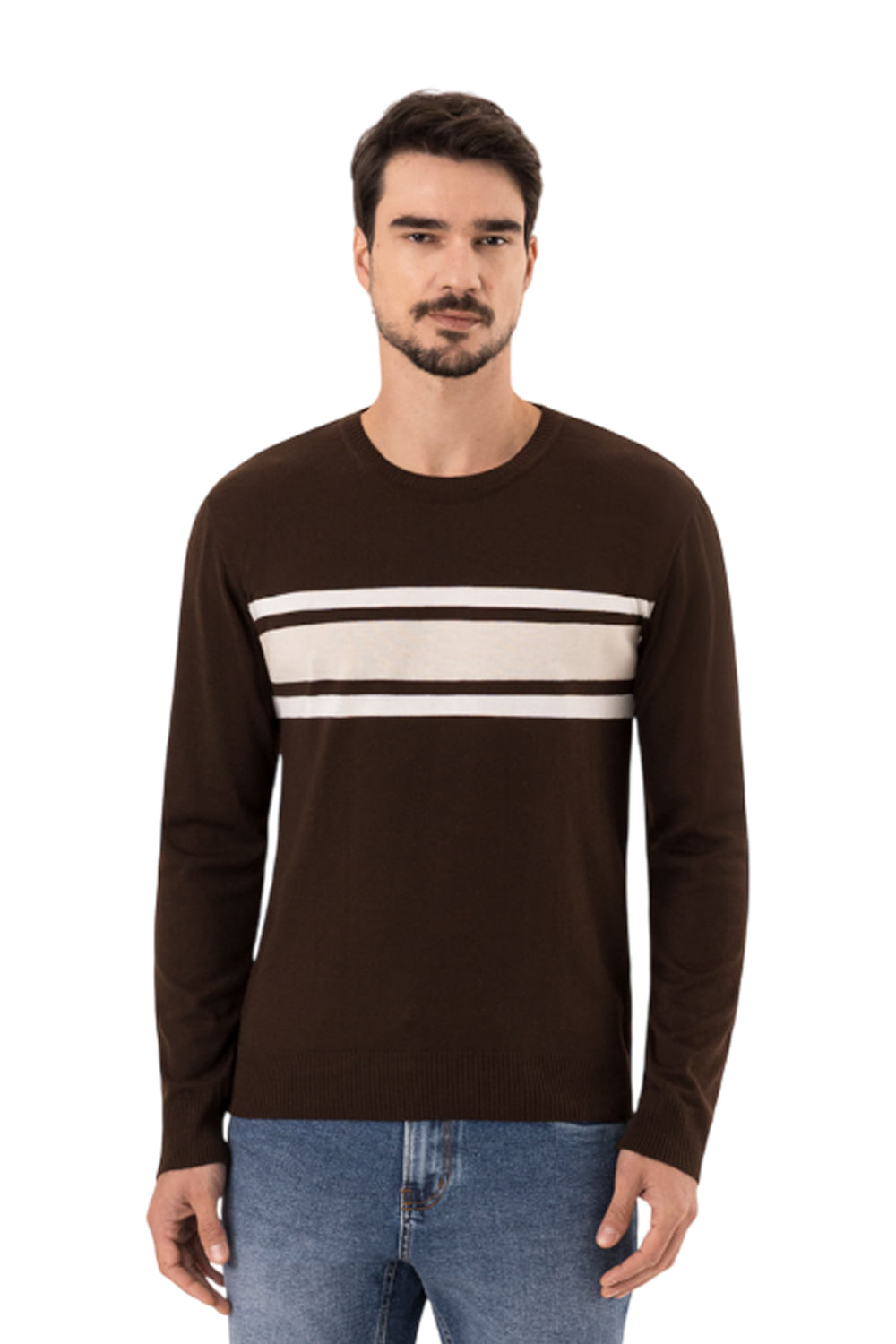 A textura suave e inconfundível do tricô faz deste blusão de mangas longas uma escolha certeira para os dias mais frios. O destaque fica por conta das listras pontuais que dão um up à modelagem atemporal. Faça sua escolha e curta os próximos voos.