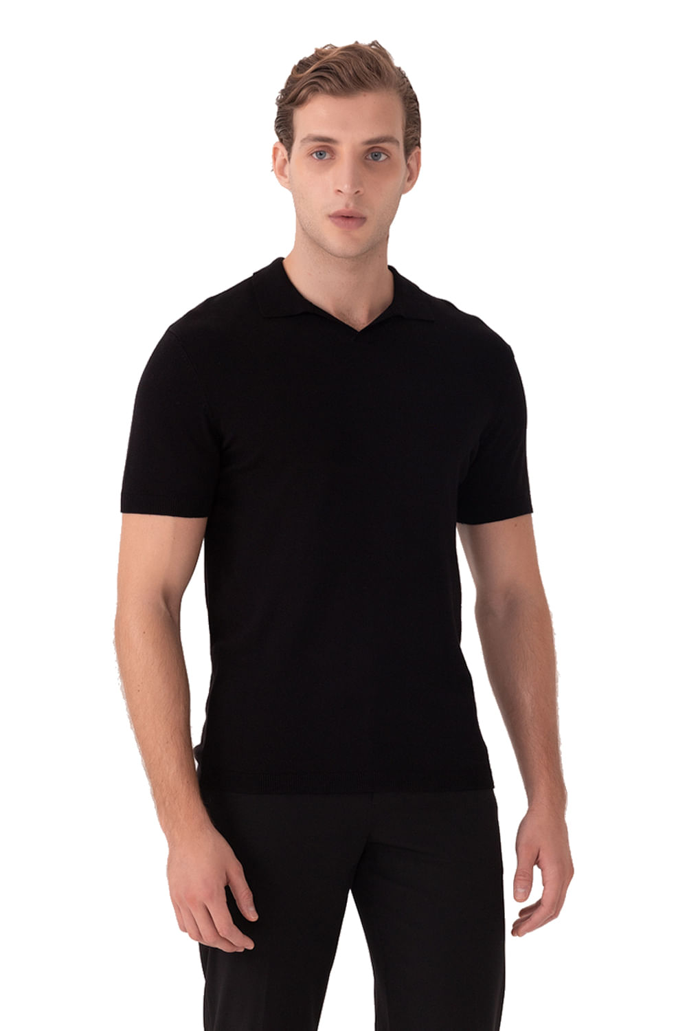 Feita em tricô, Toque macio, Mangas curtas, Gola polo, Caimento confortável.
