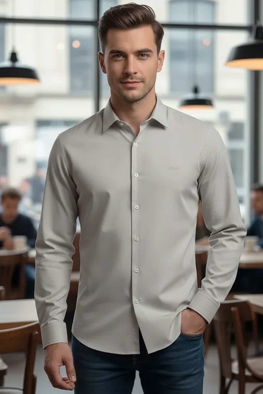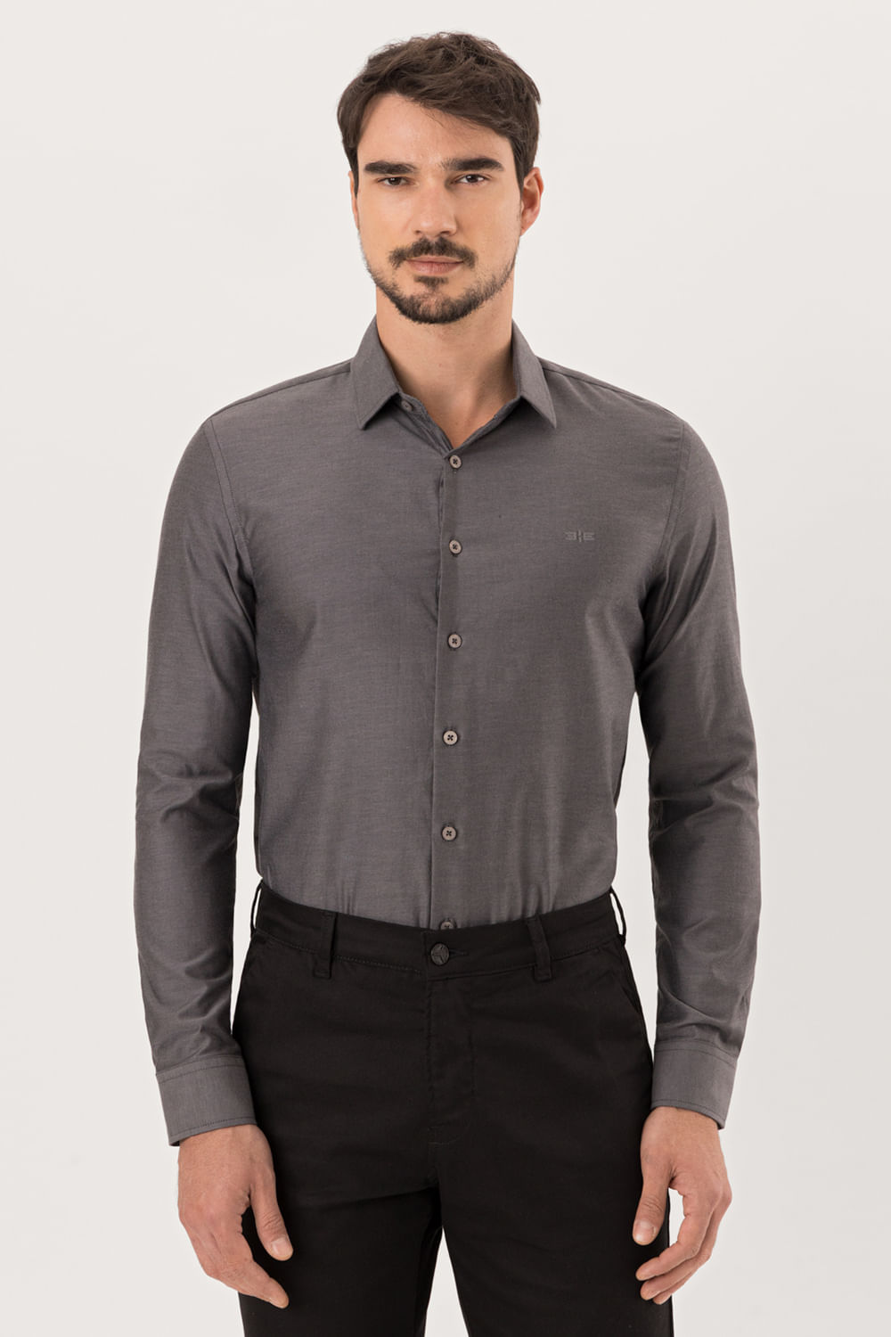 Feita em tecido plano com fios egípcios, Visual sarjado, Modelagem slim fit, Mangas longas, Gola clássica, Fechamento por botões.