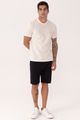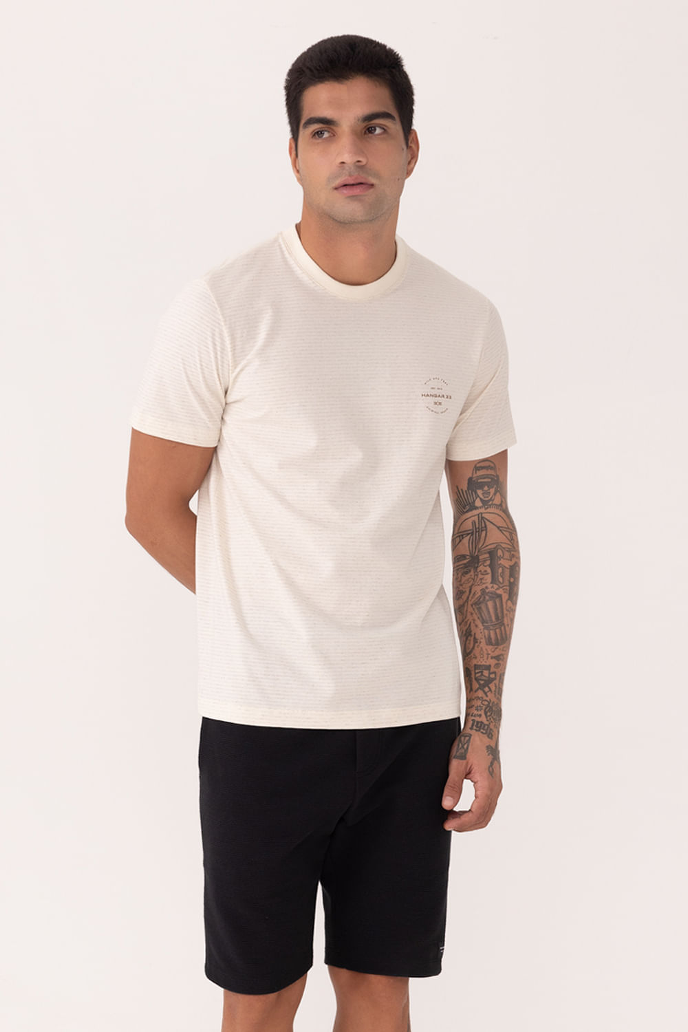 Camiseta De Mangas Curtas Em Malha Listrada Com Linho A camiseta masculina combina o visual natural do linho com o benefício dos fios tintos que impedem o desgaste das listras. Use com bermuda de sarja Hangar 33 e acrescente mais leveza ao seu estilo diário.