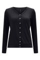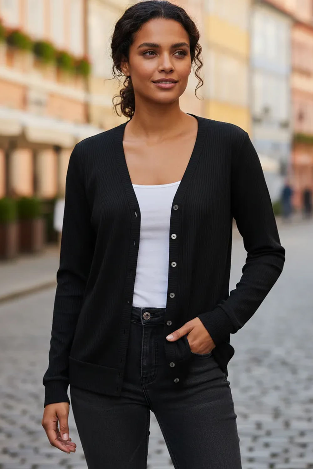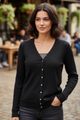 Feito com viscose responsável, Produção com menor impacto ambiental, Malha canelada com elastano, Mangas longas, Decote em V, Fechamento por botões.