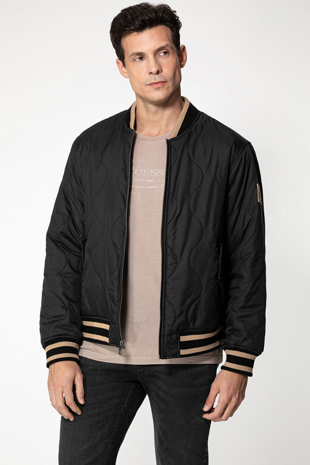 A Jaqueta bomber Guess é a Jaqueta bomber ripstop de mangas compridas, Costurado em toda a superfície, Listras em dois tons na gola alta, na barra e nos punhos canelados, Bolsos laterais com aba e botão, Fecho frontal com zíper.
