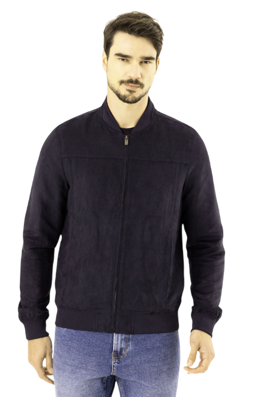 Feita em suede. Modelagem bomber. Mangas longas. Punhos ajustados. Fechamento por zíper. Caimento confortável.