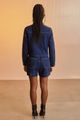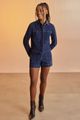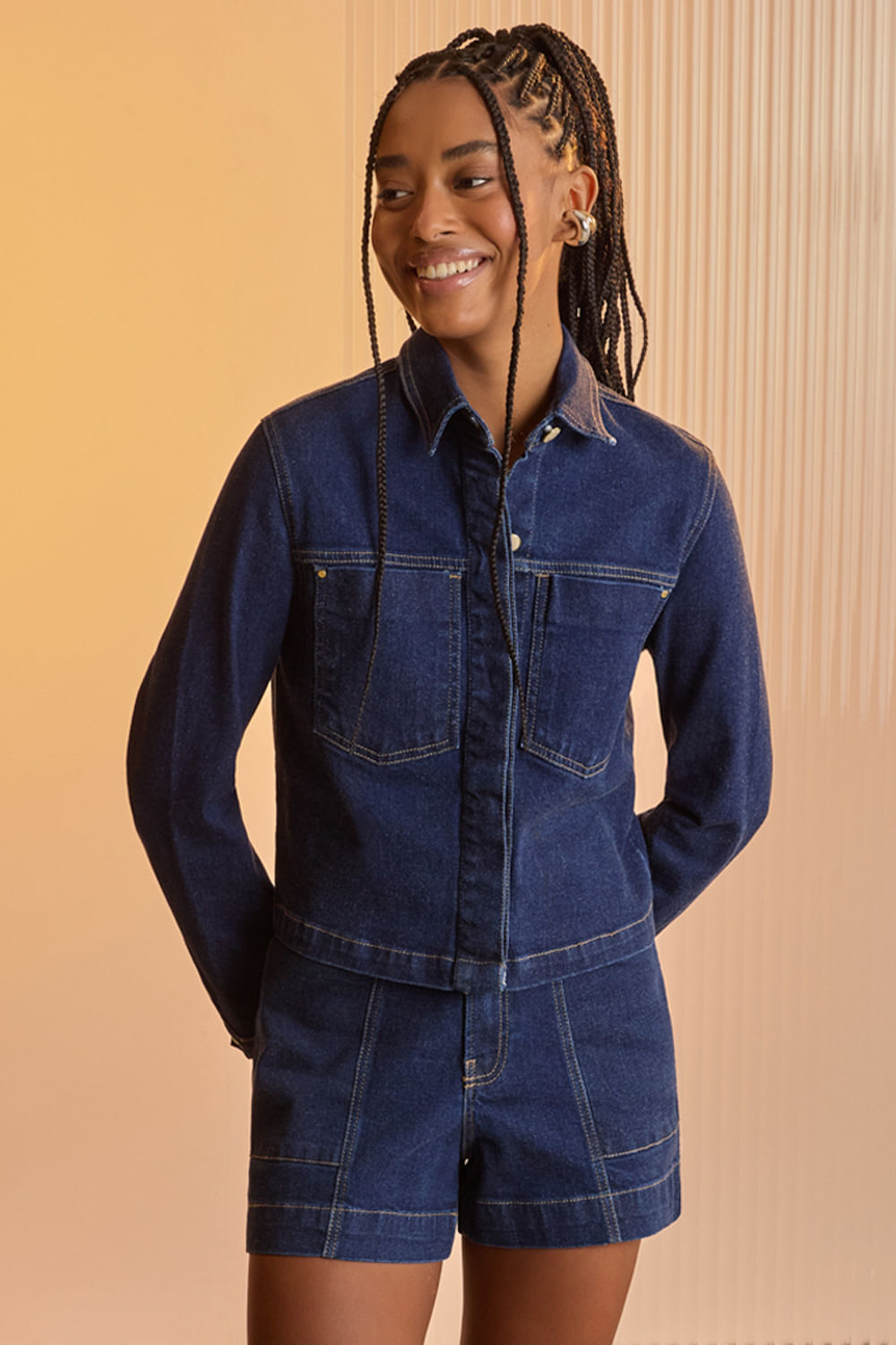 Feita em jeans com elastano, 30% de elasticidade, Comprimento cropped, Mangas longas, Gola clássica, Bolsos funcionais, Fechamento por botões.