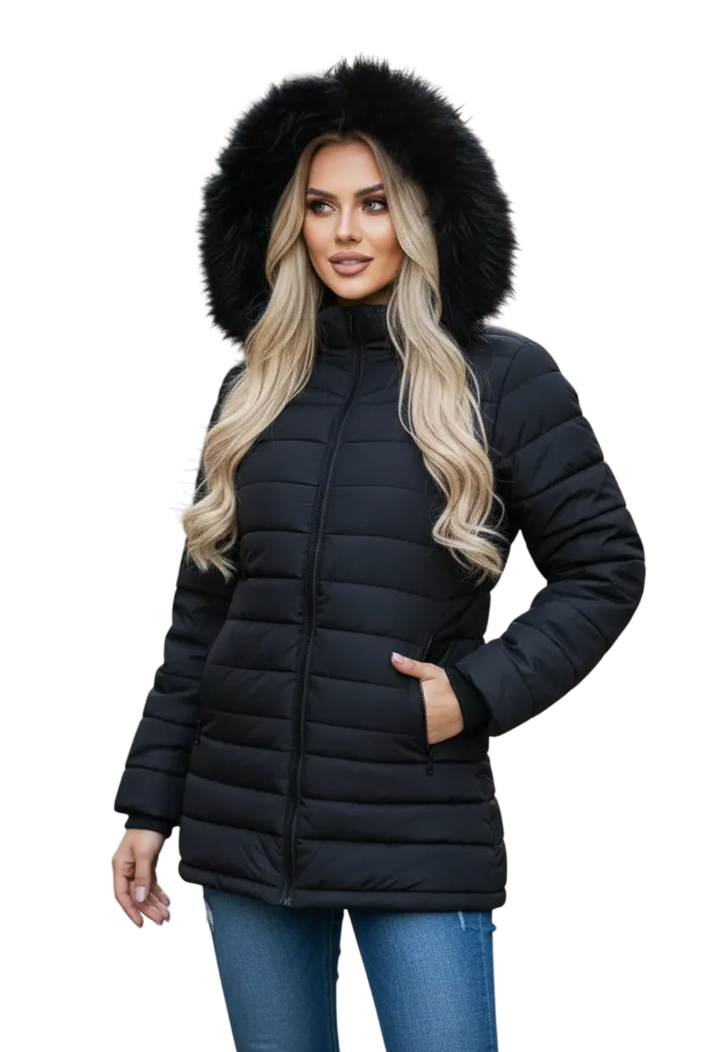 Jaqueta Puffer Alongada com Capuz Removível vem forrada com pelúcia macia no corpo, mangas com punhos de ribanas, modelagem ajustada, dois bolsos frontais com fechamento de zíper, capuz removível com pelinhos e acabamento perfeito.