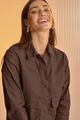 Feita em sarja amaciada com elastano, 30% de elasticidade, Mangas longas, Gola clássica, Bolsos com lapela, Fechamento por botões de pressão.