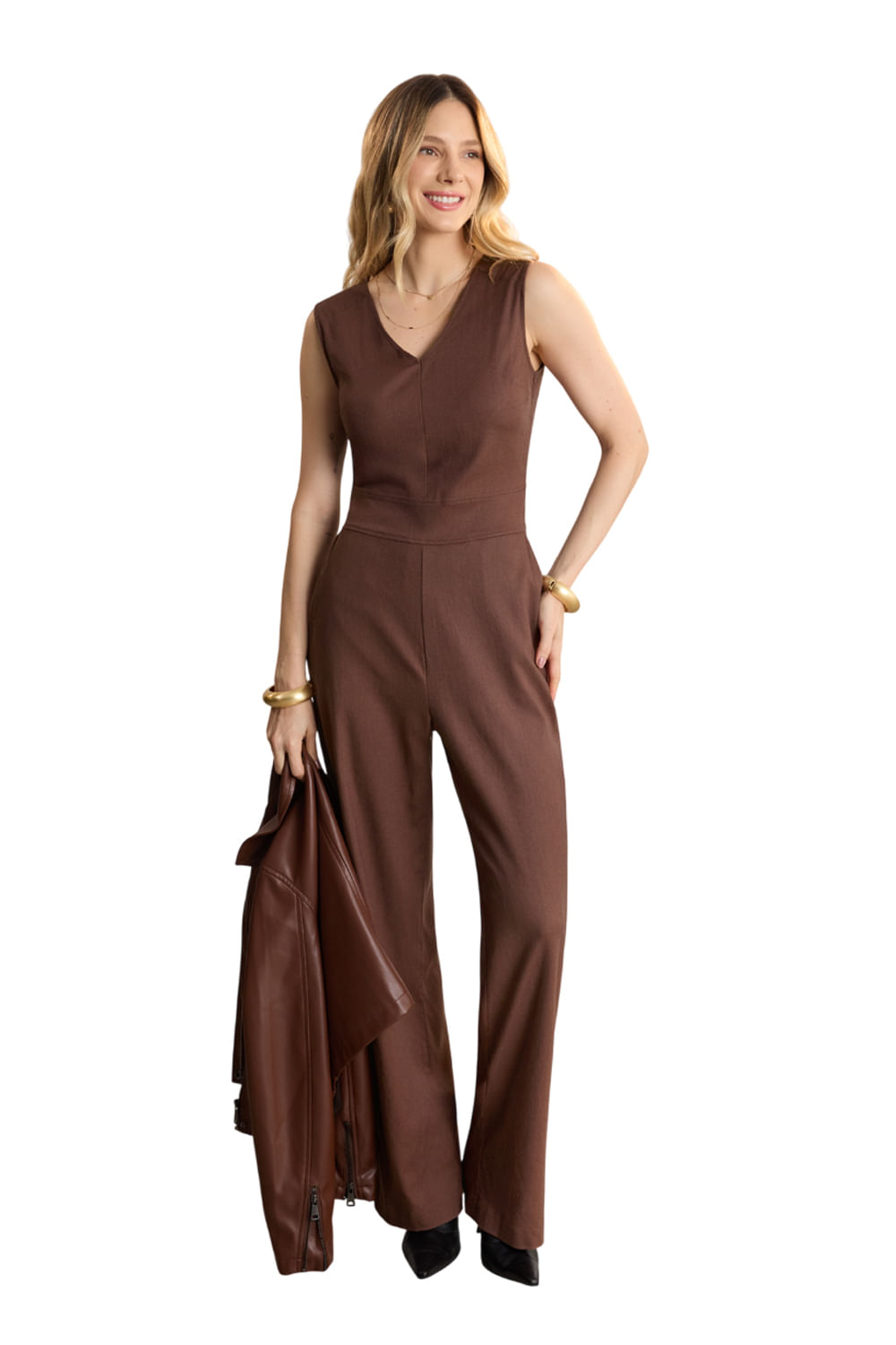 Essencialmente atemporal, o macacão longo sem mangas surge em tecido com linho que acrescenta sofisticação imediata ao visual. Para potencializar a elegância da modelagem, combine com botas e jaqueta Lunender da coleção.