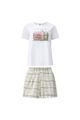 Feito em meia malha penteada de algodão, Blusa de mangas curtas, Decote redondo, Estampa localizada, Shorts com cós elás.