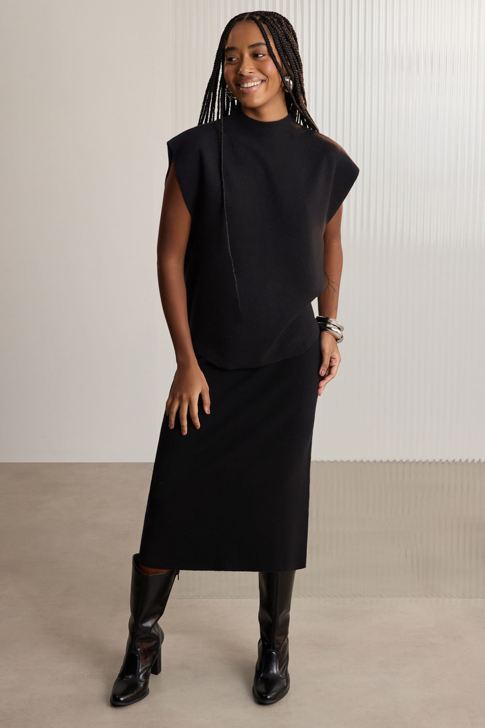 A saia midi chá cria um visual alongado que funciona com sandálias finas, botas ou propostas mais casuais. O tricô entra como aliado do conforto, acompanhando o corpo com suavidade e deixando qualquer combinação mais agradável ao vestir. Invista.