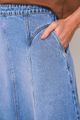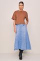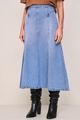 Saia jeans lavada azul médio, possui cintura alta e comprimento midi, frente com recortes, bolsos em diagonal frontais, fechamento lateral por botão e zíper. Confeccionada em jeans 100% algodão, garantindo à peça estrutura e conforto.