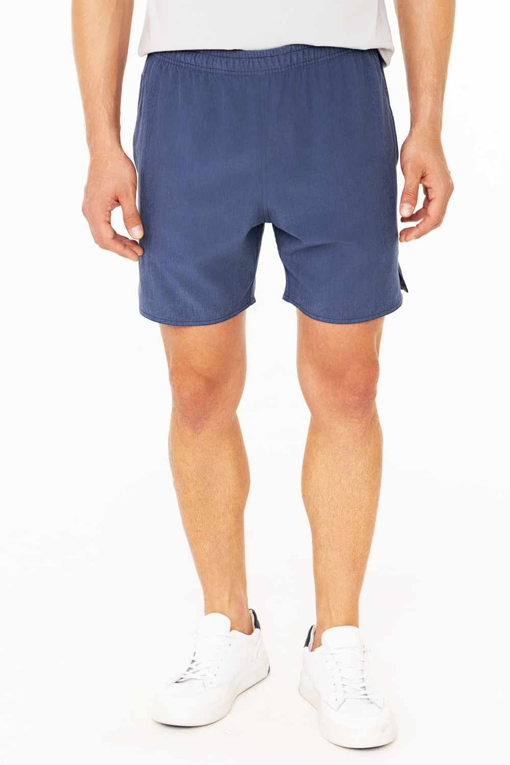 Shorts Com Bolsos E Cós Elástico Em Tecido Plano O shorts masculino com elástico no cós garante ajuste rápido e adaptação total ao corpo. Com elastano no tecido, é aposta certeira para quem vive em movimento. Use com camiseta Hangar 33 de mangas curtas.