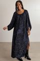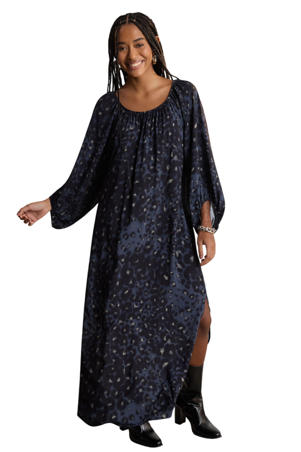 Feito com viscose responsável, Tecido plano e leve, Caimento fluido, Comprimento chá, Mangas 3/4, Fendas laterais, Decote e punhos com elástico.