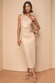 Vestido long midi de tule forrado, decote assimétrico, sem manga, detalhe franzido frente.