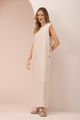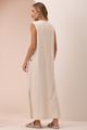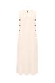 Feito em malha com linho, Comprimento chá, Decote redondo, Fendas na barra, Botões laterais decorativos.