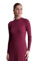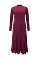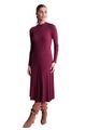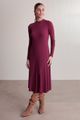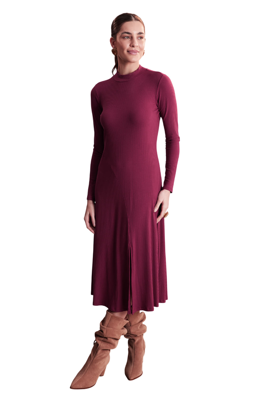 Feito com viscose responsável, Produção com menor impacto ambiental, Malha canelada com elastano, Comprimento midi chá, Mangas longas, Fenda na barra.