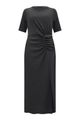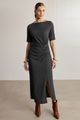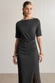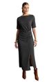 Feito em malha texturizada, Elastano na composição, Comprimento midi chá, Mangas curtas, Recorte com franzidos laterais, Fenda na barra.