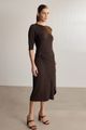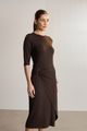 Feito com viscose responsável, Produção com menor impacto ambiental, Malha macia com elastano, Comprimento midi chá, Mangas 3/4, Sobreposição lateral com argola, Gola redonda.